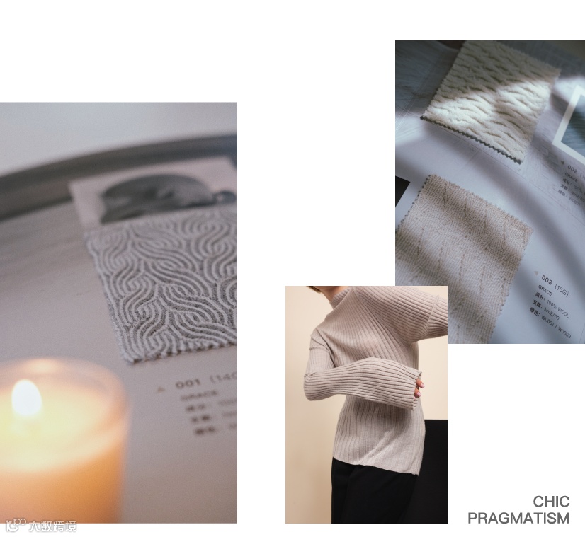 我们采用细腻柔软的羊毛纱线,以精致简约的纹样呈现轻量化且无束缚感的舒适针织系列。参照建筑的优雅线条,运用流动感的褶皱纹理,挑选不规则的螺纹组合,抓住各种状态下的细节,呈现出自然流畅且饱满的肌理触感。在生活中摸索前行,提高自我需求的认知,让三点一线的着装步入实用精致的轨道。