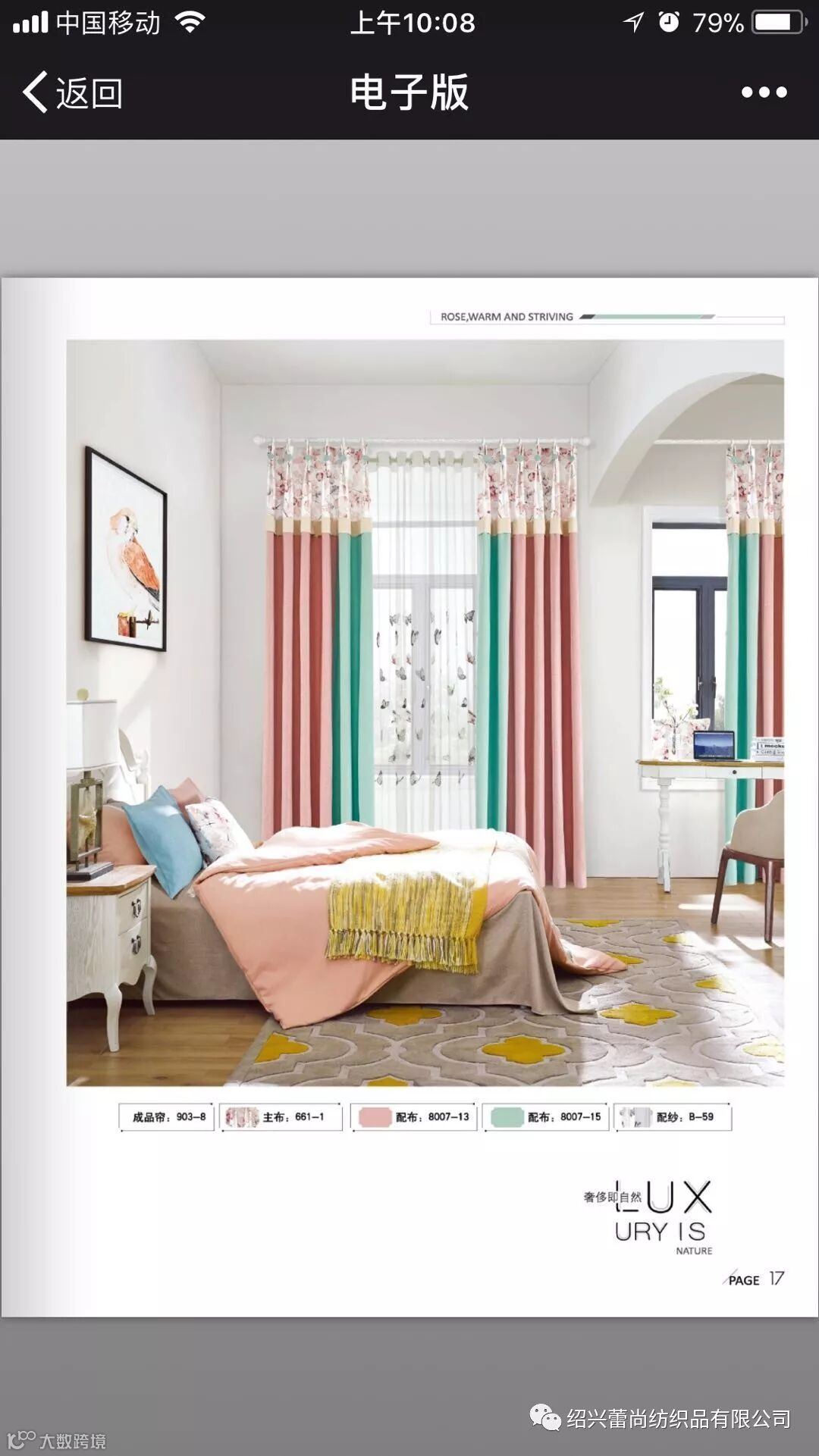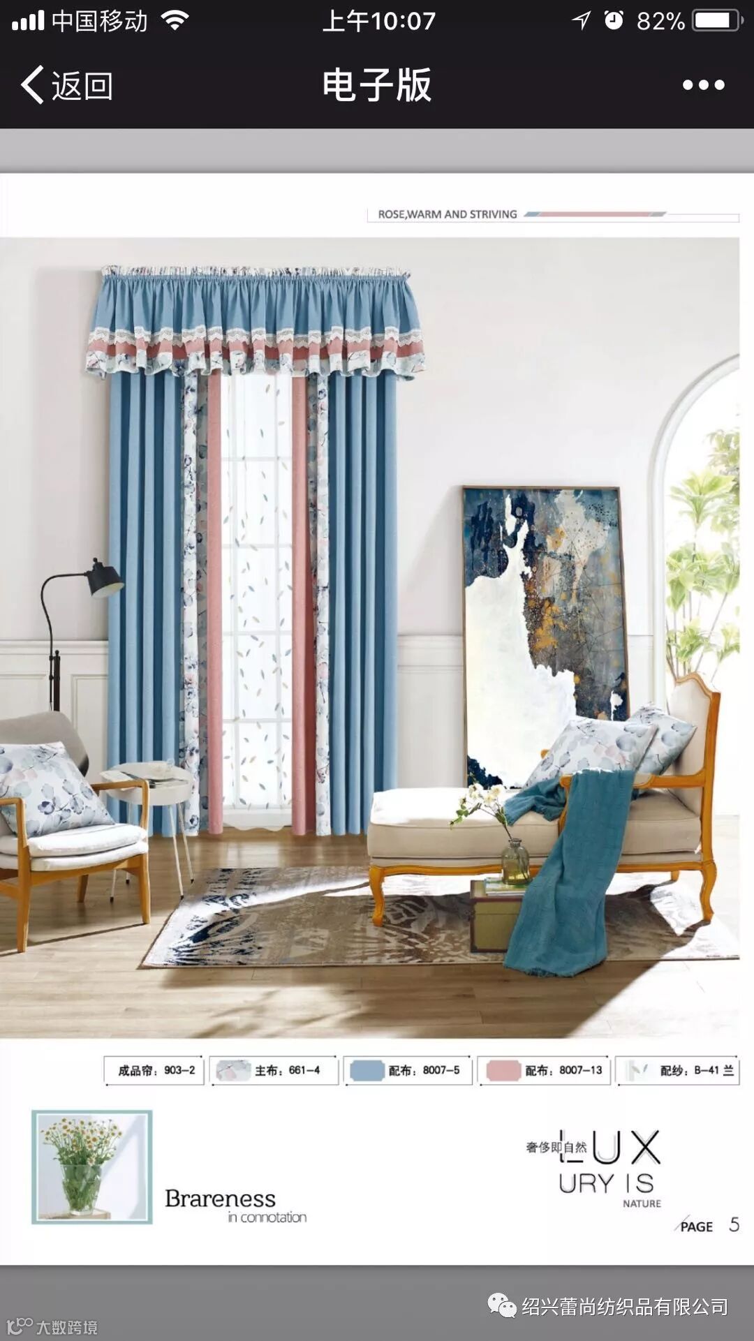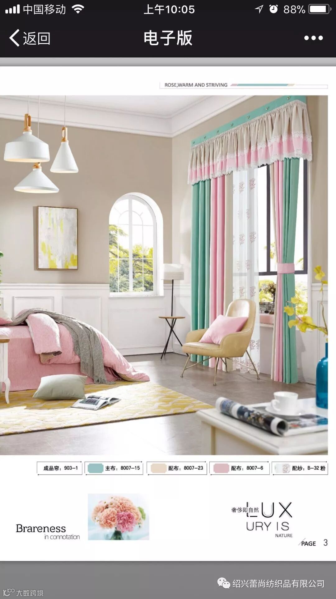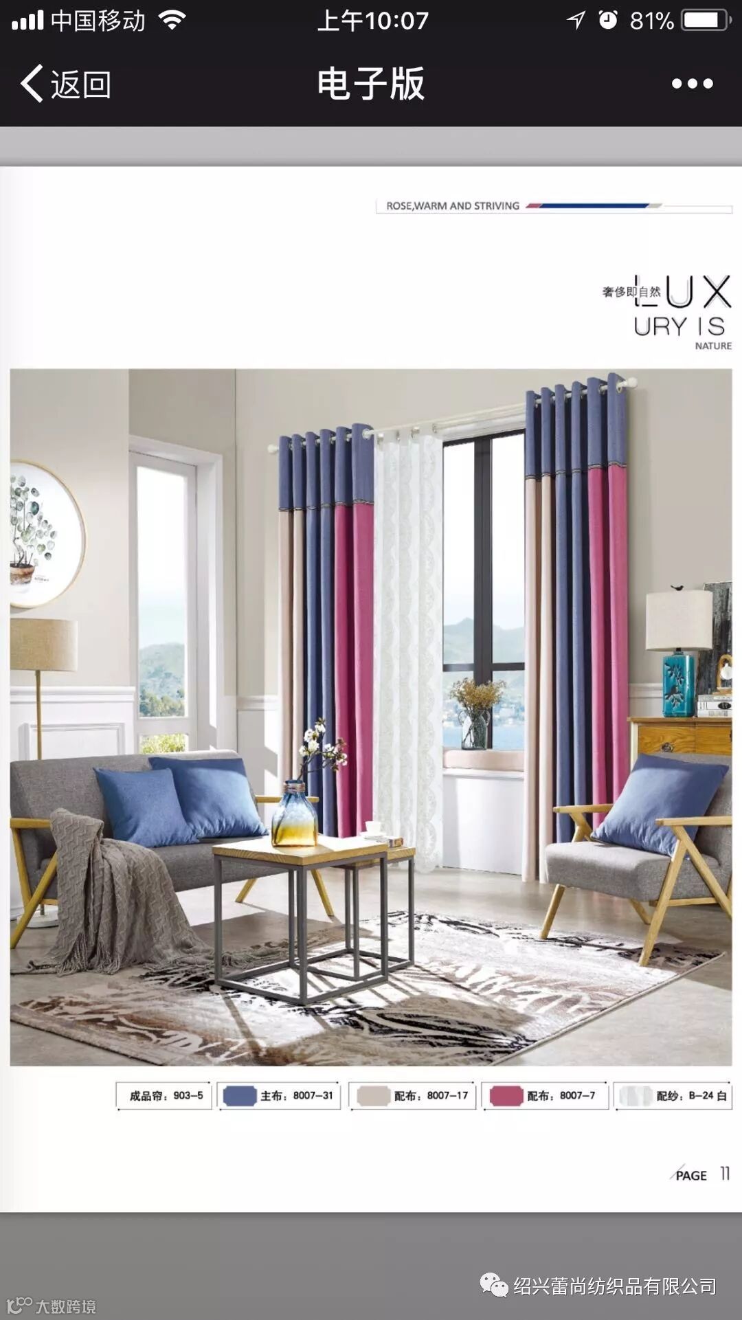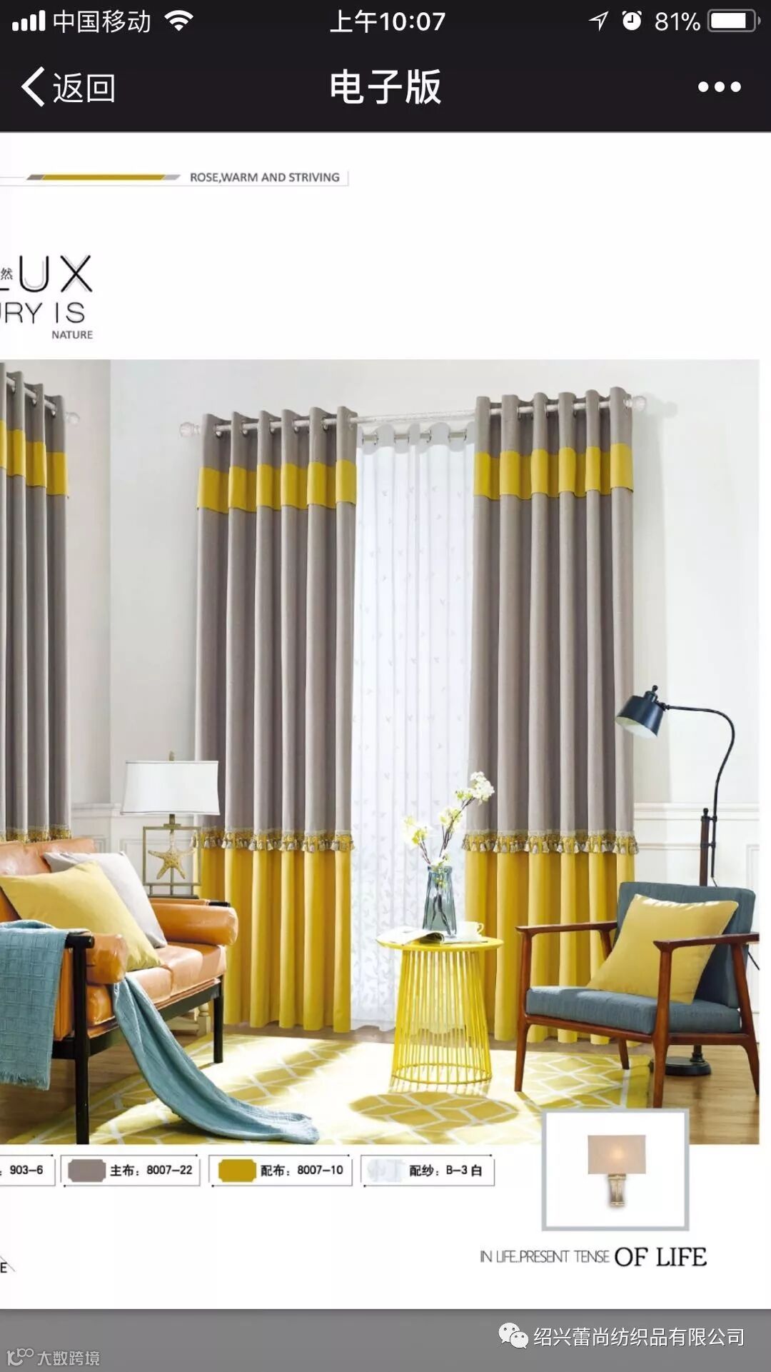 此公众号为绍兴蕾尚纺织品有限公司官方企业号,在这里分享纺织品最新资讯,传播布艺文化!本公司生产各类高档窗帘,窗纱,遮光布色坯,白坯及来样定做喷气提花产品!
