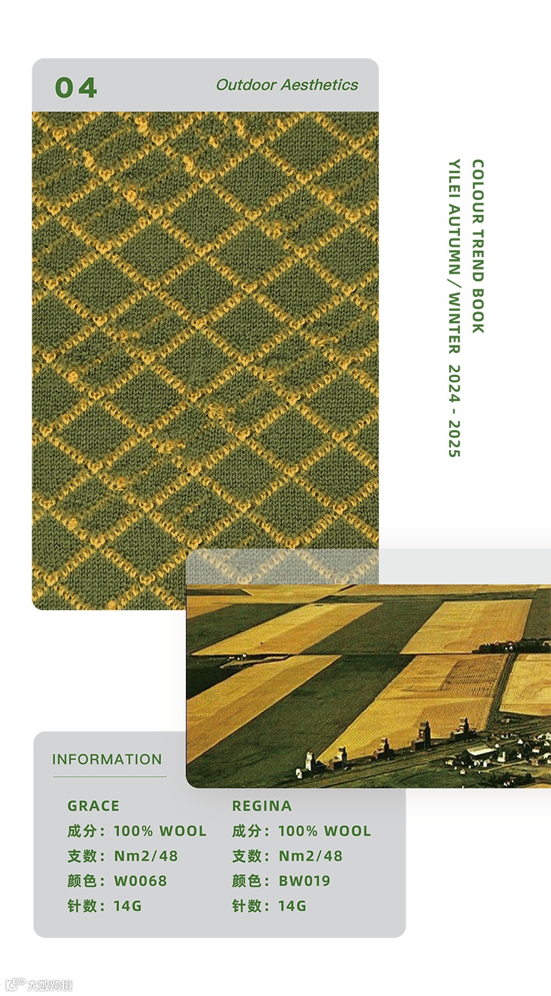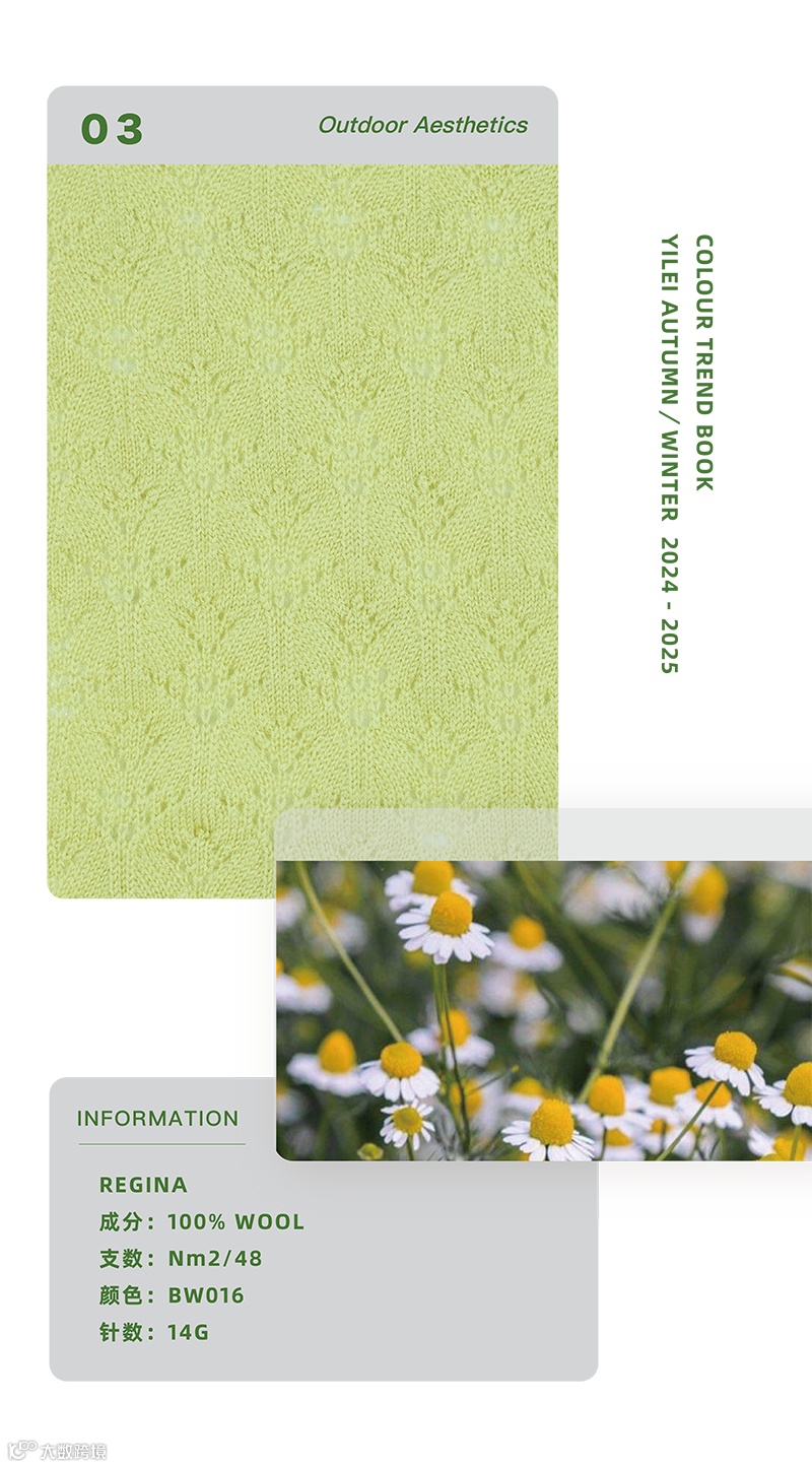西芹汁绿、苹果绿、藏蓝、暖棕色、落叶黄组成户外露营的天然色彩,自然滤镜下的颜色将被赋予时代新背景,纯净、原始、鲜活。其中绿色系一贯的治愈与舒缓的特性在这个色组中起到关键作用,带我们进入自然的语境,仔细体会自然的语言。在这组花型中,织物选择了更具舒适导向的天然纤维,自然色彩的质感也进一步突显了羊毛羊绒的舒适程度。我们在部分织片中加入了欧根纱来模拟叶片清晰通透的脉络肌理,以及运用多种点状、块状肌理组织来模拟星空和山丘田野。