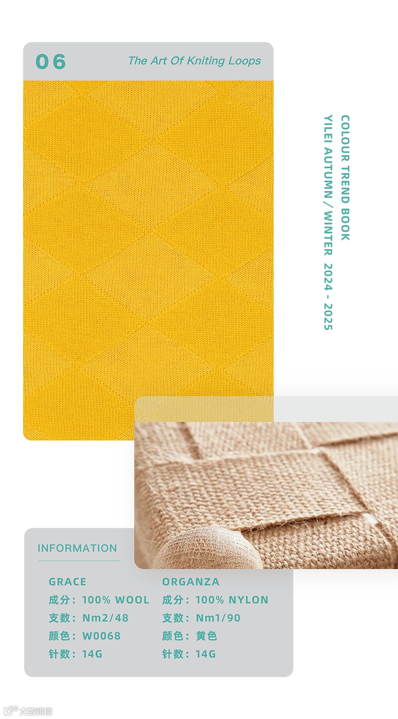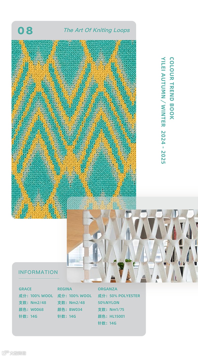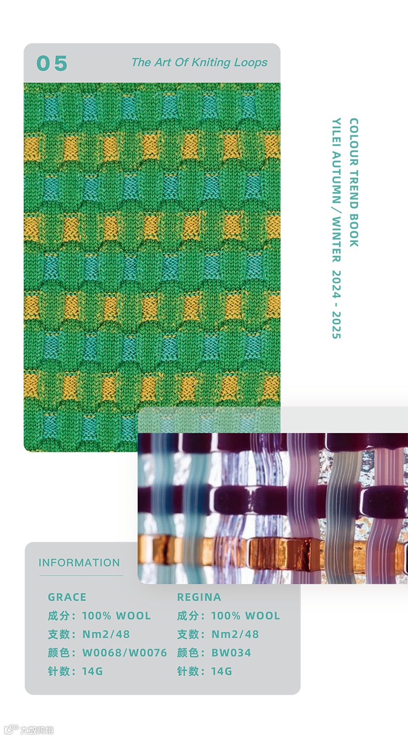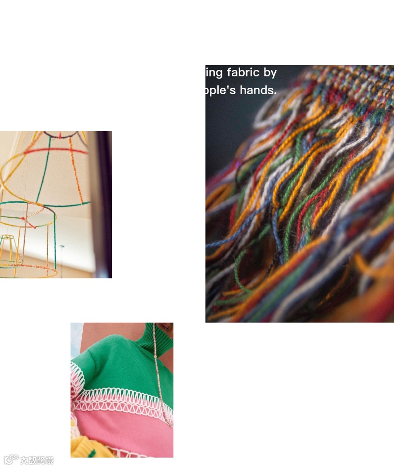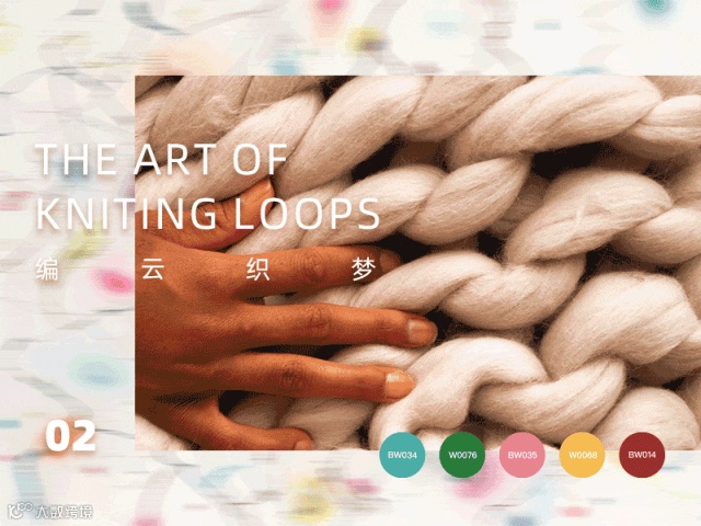 在当下复古的流行趋势中,更多带有趣味性的编织迈入了大众的视线。本章节在多样化的编织中获得色彩灵感,我们组合了草莓粉、湖水蓝、电车绿、深红、落叶黄等鲜亮跳脱的颜色,结合温暖的羊毛、羊绒等天然材质,呈现出具有温暖外观的针织。将各类手工编织元素运用到针织表面,并以多种几何图案模拟编织品的形态以及呈现的空间感。