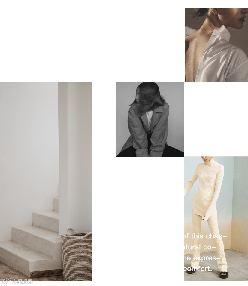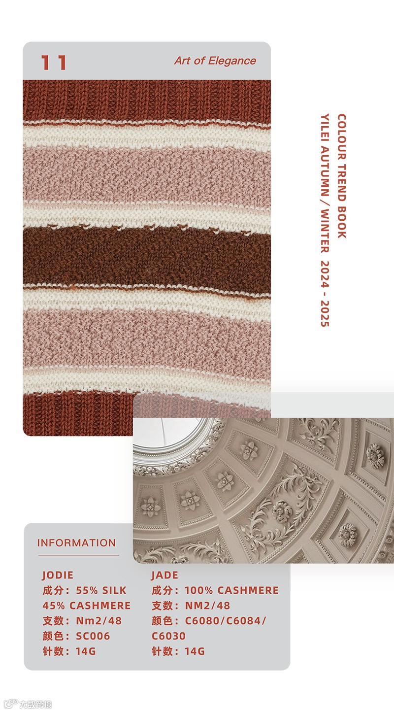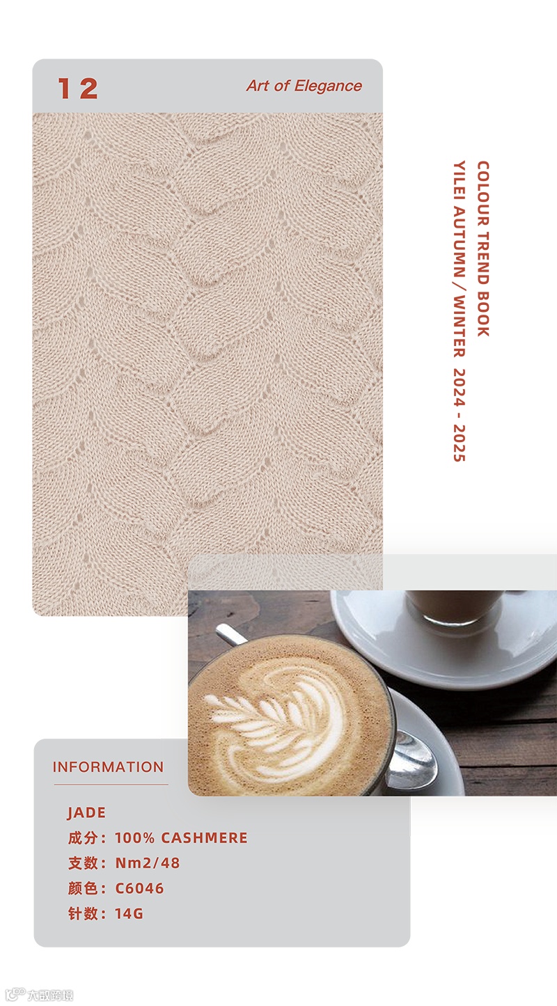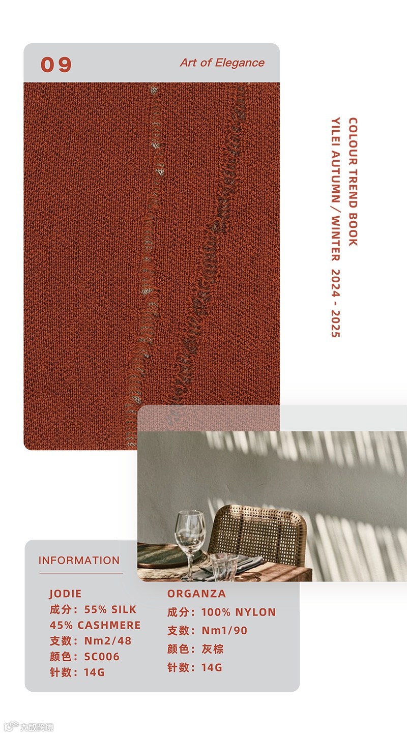 本章色系以中性色作为导向,专注于表达经典与舒适度,大面积的纯白配合临近色米白奠定舒缓而优雅的基调,同时融入低饱和度的橡皮红和浓郁的栗棕色系焕新整组色系的视觉效果,响应人们对经典柔和色彩的持续追求,将优雅和经典展露无遗。运用极简柔和的线条和立体绞花组织,焕发羊毛羊绒等天然纤维的细腻肌理,呈现视觉和质感的多维要求。