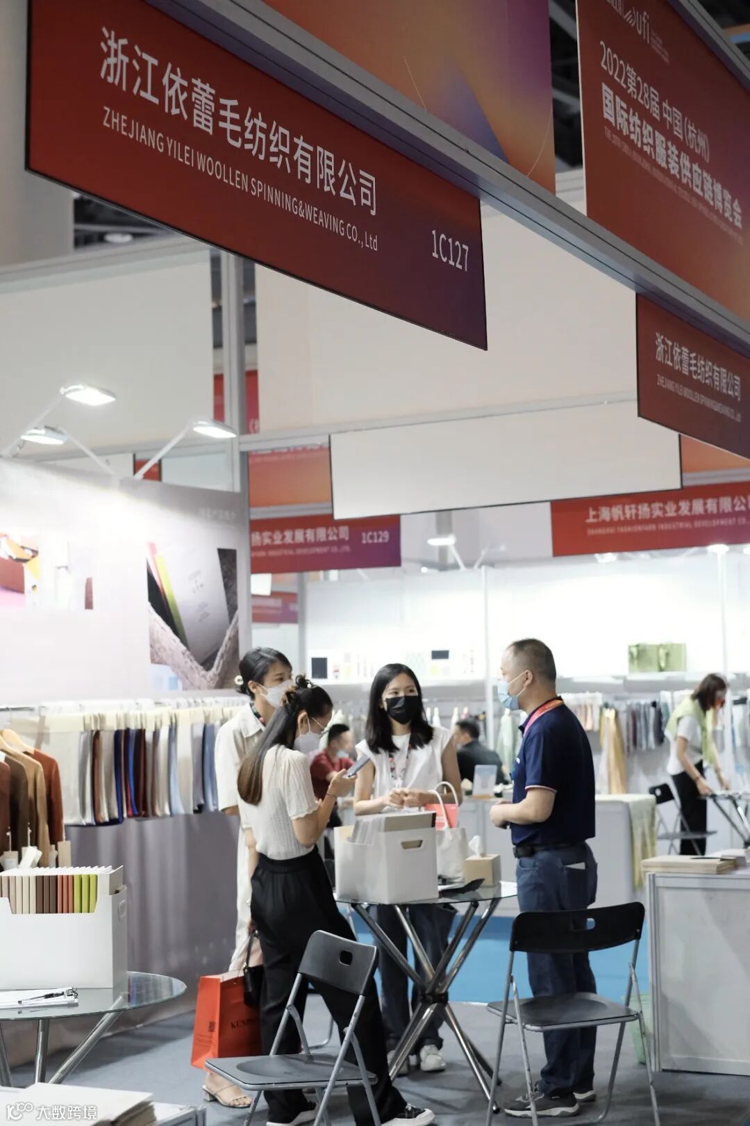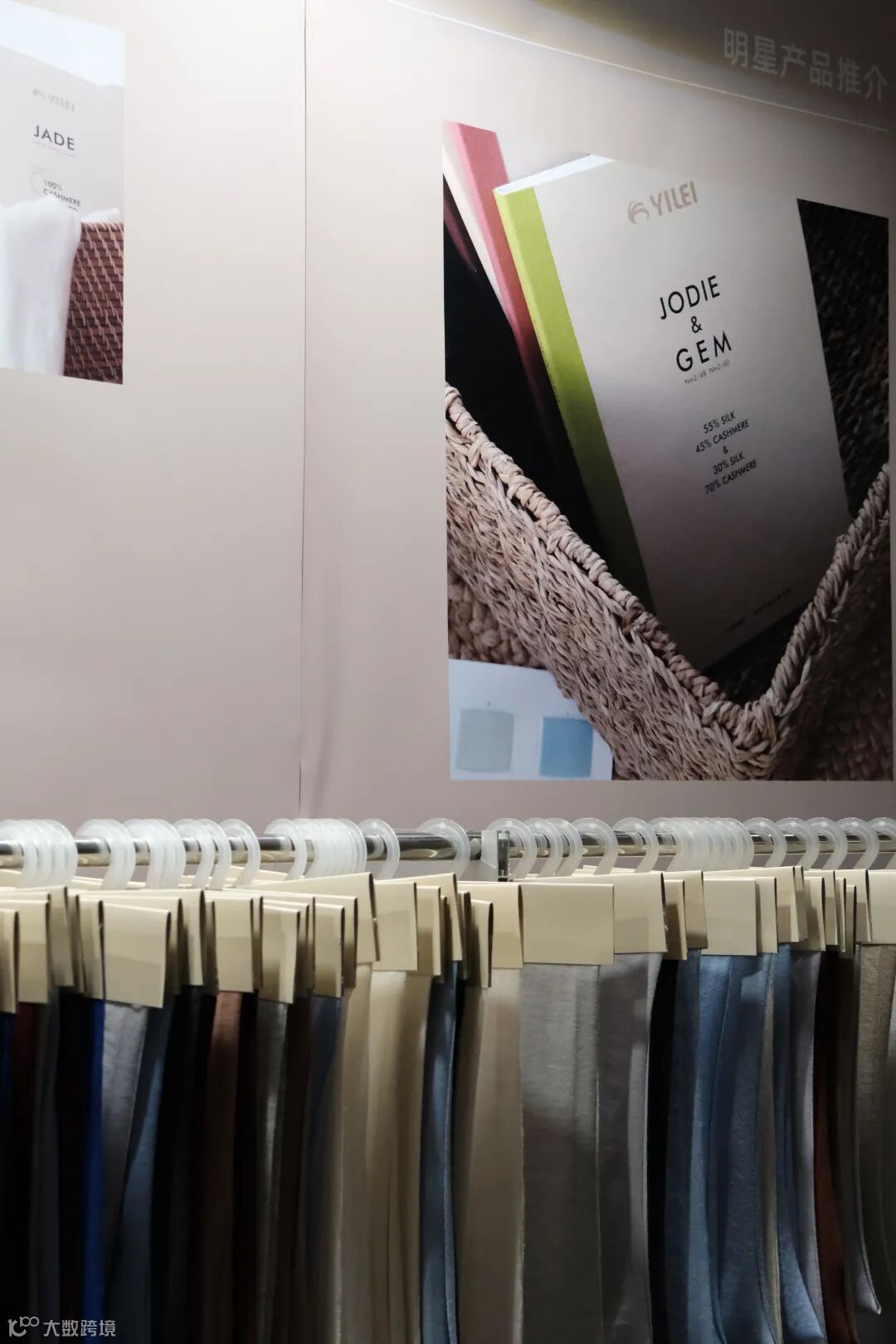 展会布置以精简的方式呈现吊钩样的质感与色彩,同时为了更直观地展现精纺纱线的品质,携带了部分样衣作为展示,客户可以直接感受到织物的细腻触感和清晰肌理。