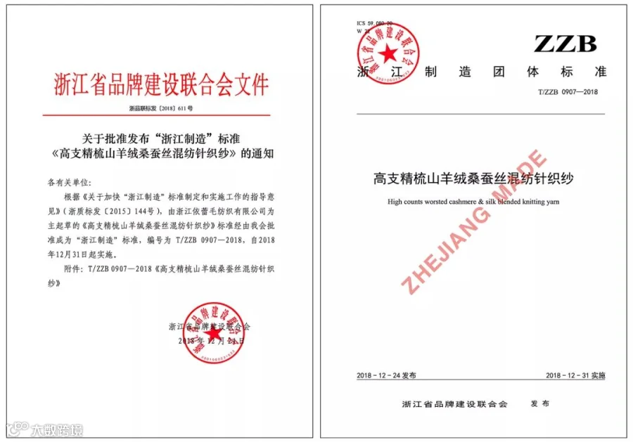 由浙江依蕾毛纺织有限公司主起草的《高支精梳山羊绒桑蚕丝混纺针织纱》“浙江制造”团体标准,通过了省级专家的评审,于12月24日由浙江省品牌建设联合会批准正式发布。