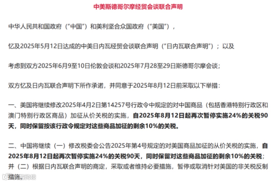 8月10日,中美发布联合声明:双方再次暂停实施24%的关税90天,保留剩余10%的关税。