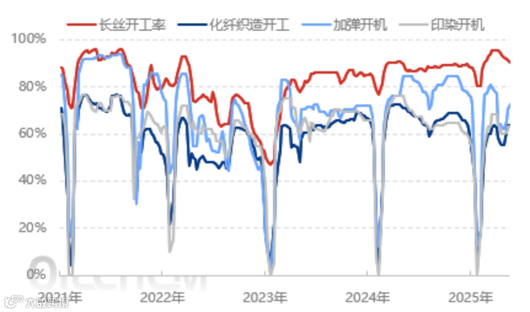 整体从终端纺织需求来看,前期关税利好多释放,目前外贸订单气氛略有下降,终端订单水平表现一般,拖累终端业者心态,虽前期受关税缓和影响部分订单升温,但近期随着手内订单交期发货,新单询盘窄幅回落,坯布库存压力仍较为明显,工厂多清库为主,成品库存平均水平本周增加。江浙终端开工逐步趋稳,江浙加弹开工维持80%,江浙织机开工维持在69%,江浙印染开工在77%。后期随着气温的回升,终端纺织企业开工也将逐步进入下滑通道。
