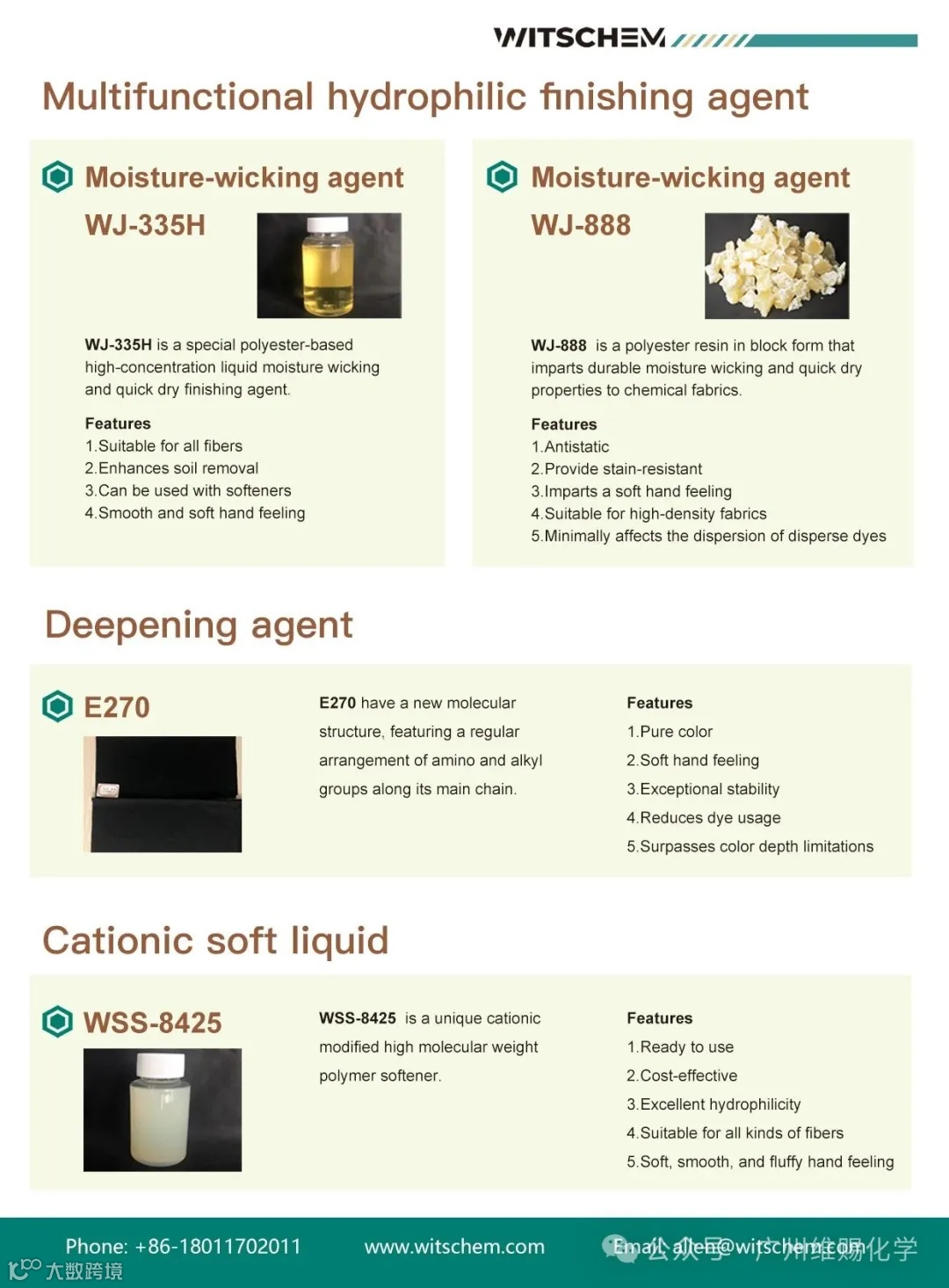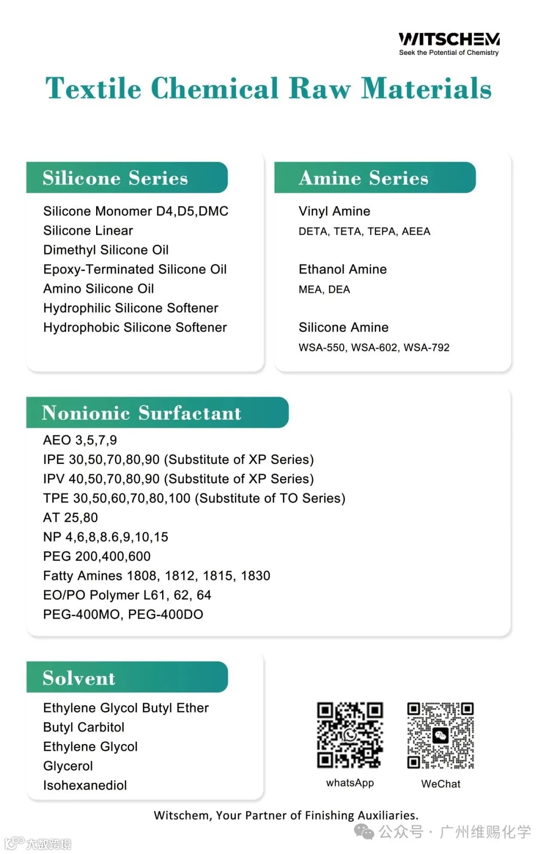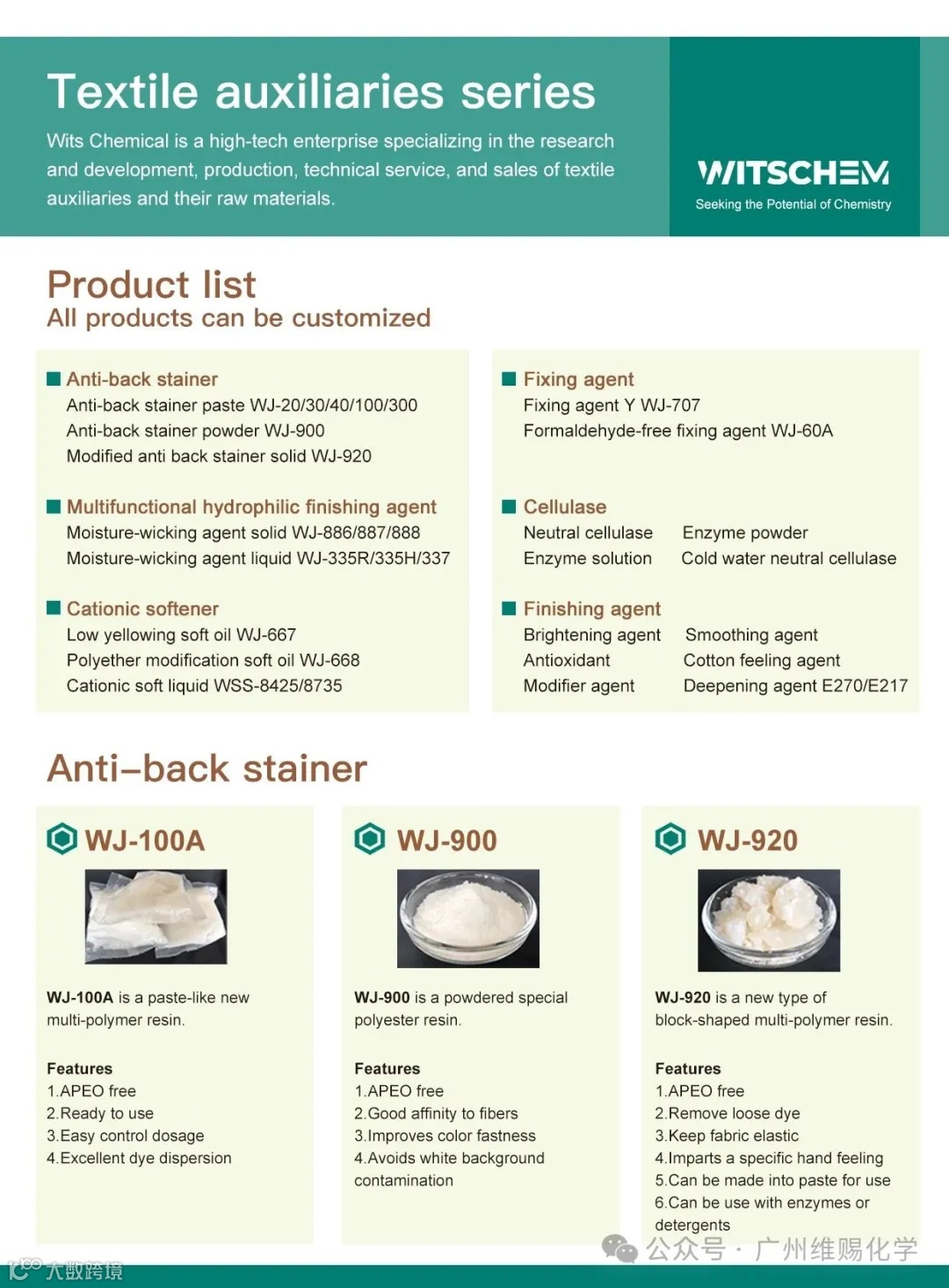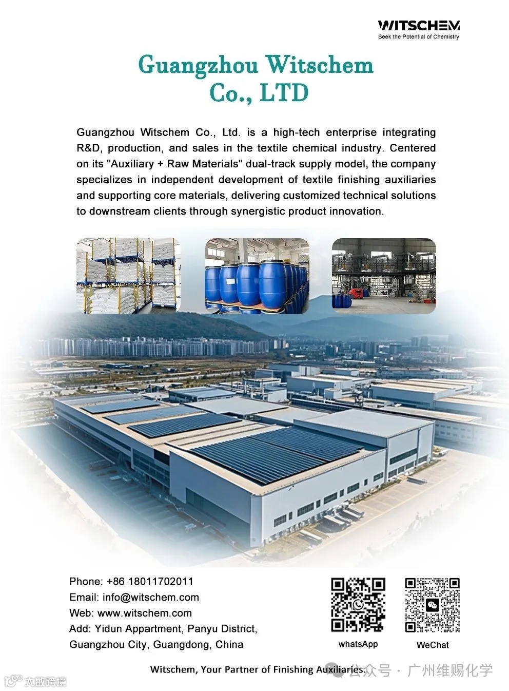 Guangzhou Witschem Co., Ltd. is a high-tech enterprise integrating R&D, production, and sales in the textile chemical industry. Centered on its "Auxiliary + Raw Materials" dual-track supply model, the company specializes in independent development of textile finishing auxiliaries and supporting core materials, delivering customized technical solutions to downstream clients through synergistic product innovation.
