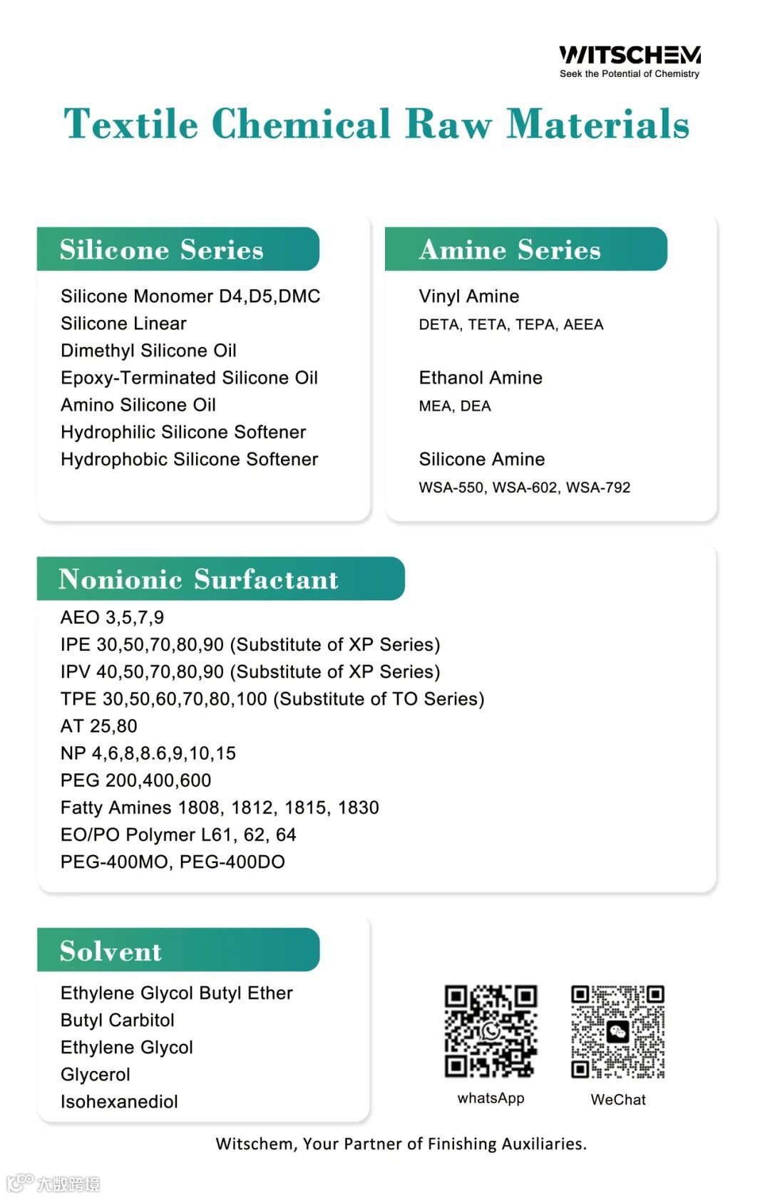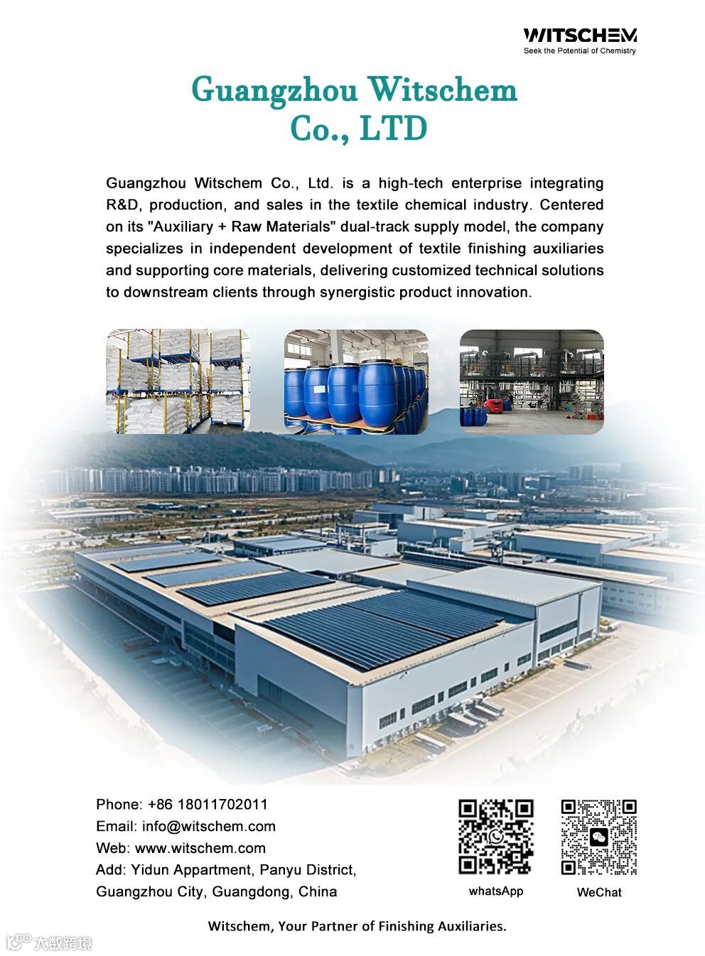 Guangzhou Witschem Co., Ltd. is a high-tech enterprise integrating R&D, production, and sales in the textile chemical industry. Centered on its "Auxiliary + Raw Materials" dual-track supply model, the company specializes in independent development of textile finishing auxiliaries and supporting core materials, delivering customized technical solutions to downstream clients through synergistic product innovation.