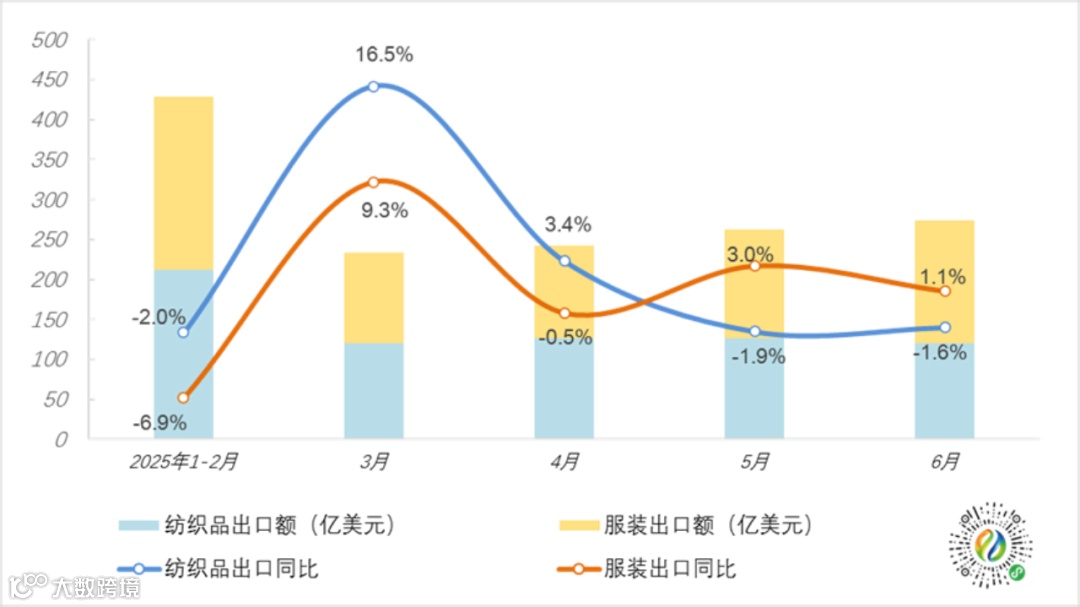 根据海关总署今日统计快讯,今年上半年,我国纺织行业对外贸易承压之下总体平稳。以美元计,1~6月我国纺织品服装出口额为1439.8亿美元,同比增长0.8%,其中纺织品出口705.2亿美元,同比增长1.8%;服装出口734.6亿美元,同比微降0.2%。