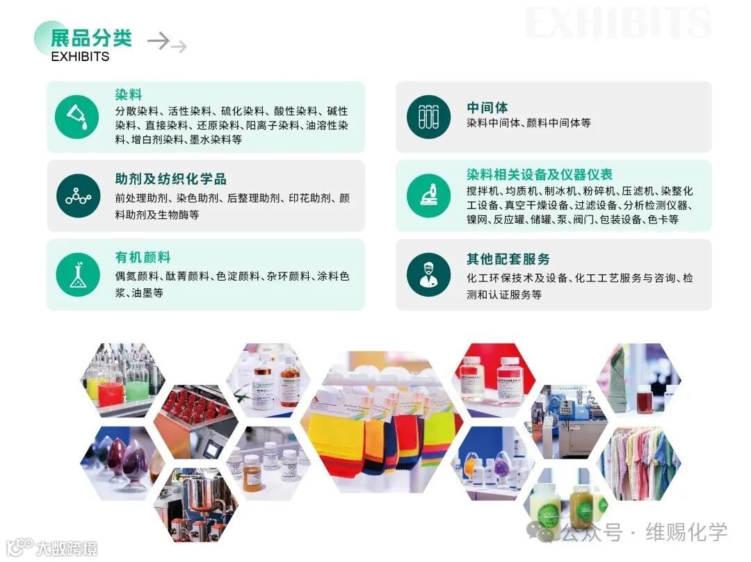展会涵盖环保型染料、有机颜料、助剂、中间体、仪器设备、数码印花技术等全产业链,细分展区包括: