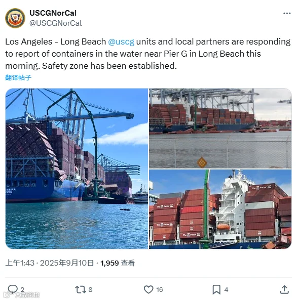 为确保集装箱安全,港口作业暂时中止,长滩港发言人表示,当局正试图查明事故原因。