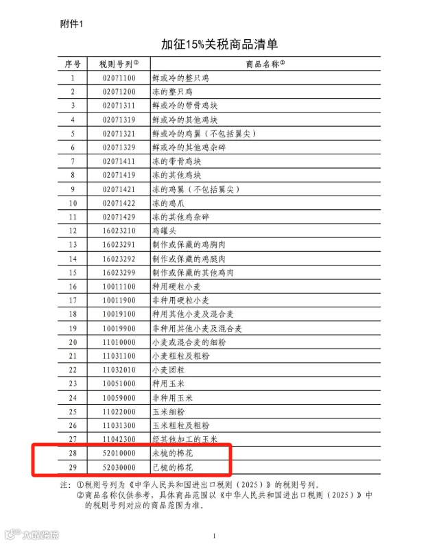 一、对鸡肉、小麦、玉米、棉花加征15%关税。