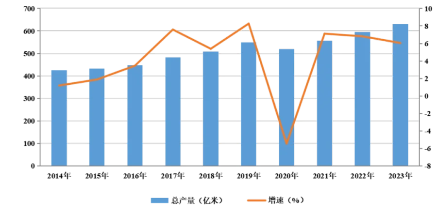 据中国长丝织造协会统计,截至2023年底,我国长丝织造行业织机规模达到92.7万台,其中喷水织机85.5万台,同比增长11.04%。2023年全年我国化纤长丝织物总产量达到631亿米,同比增长6.05%。