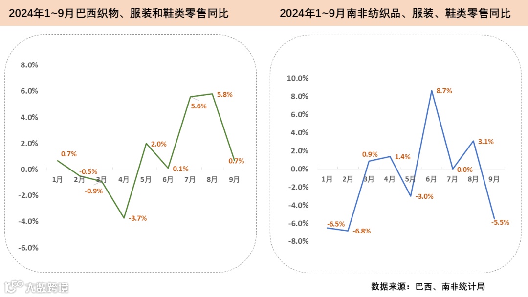 今年9月,受食品和住房价格上涨影响,巴西通胀率升至4.4%,高于上月的4.2%,通胀压力犹存。1至9月,巴西织物、服装和鞋类零售额呈波动上行趋势。在8月同比增幅达到5.8%的峰值后,9月服装相关零售增长显著放缓,同比增幅仅为0.7%。