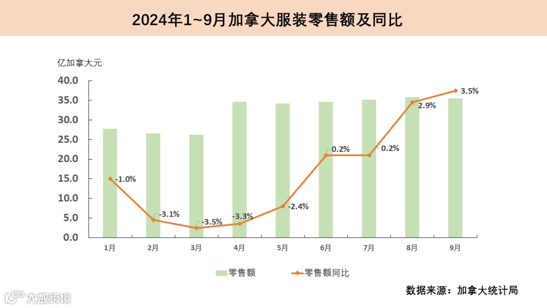 今年上半年,加拿大服装零售额同比增速持续为负。随着货币宽松政策逐渐显效,6月起服装零售额止跌回升。今年9月,加拿大服装及配饰零售额达35.5亿加元(约25.3亿美元),同比增长3.5%,环比略减少0.8%。