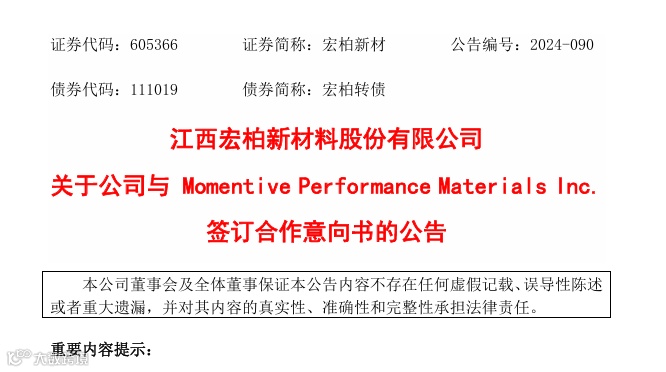 2024年8月20日,宏柏新材披露,公司近日与Momentive Performance Materials Inc.(以下简称“迈图公司”或“迈图”)签署《合作意向书》,双方有意进行一项业务合作,共同生产和销售某些硅烷产品,包括生产和销售该等产品所需的关键中间体和原材料。
