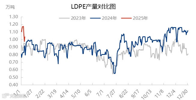 截至1月9日,国内LDPE下游开工率在42.30%,较上周期下降了1.06个百分点。本周农膜市场需求逐渐转淡,订单跟进受限,部分企业开工小幅下滑;棚膜需求进一步减少;地膜启动缓慢开工一般,其他企业零星开机或停机为主。包装膜行业平均开工率也不高,规模日化包装、食品复合包装企业虽有终端刚需,但新单跟进零星,企业多以定制单集中生产为主,整体需求对市场的支撑作用较弱。临近春节,下游消费表现平淡,节前终端备货采购有限。