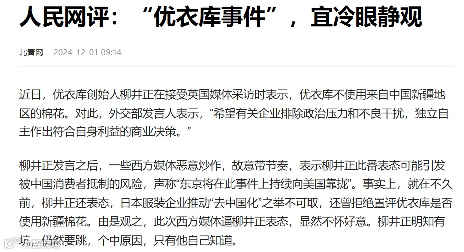 近日,优衣库创始人柳井正在接受英国媒体采访时表示,优衣库不使用来自中国新疆地区的棉花。