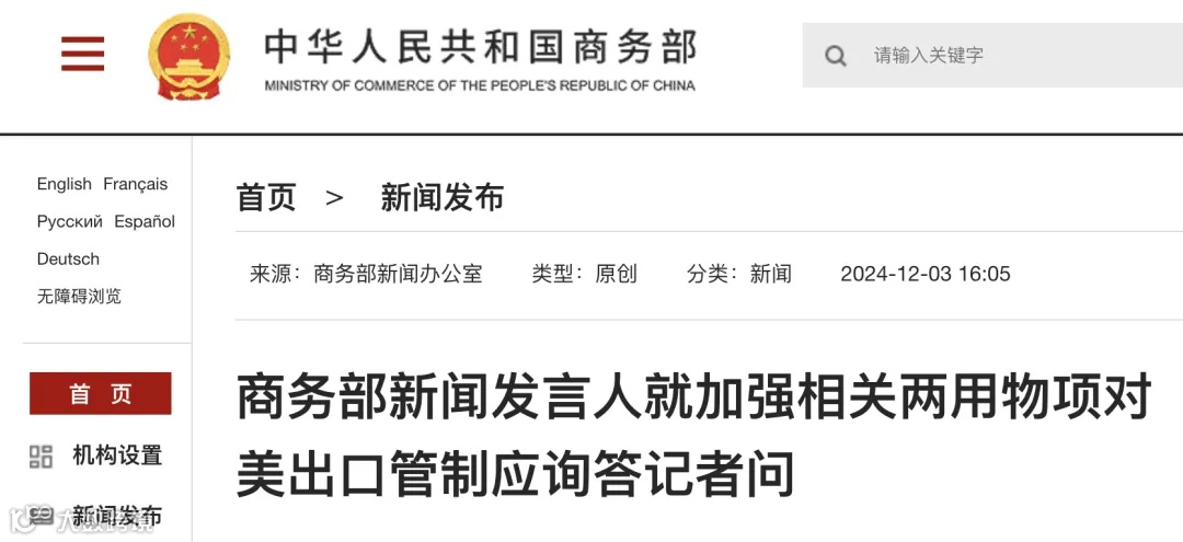 12月3日,商务部公告称,根据《中华人民共和国出口管制法》等法律法规有关规定,为维护国家安全和利益、履行防扩散等国际义务,决定加强相关两用物项对美国出口管制。中国此次管制的两用物项均是高技术产业链核心材料,中国加强对美出口管制,是反制美国技术打压,也是维护国家安全与资源战略。此举措捍卫中国权益,影响全球产业链。