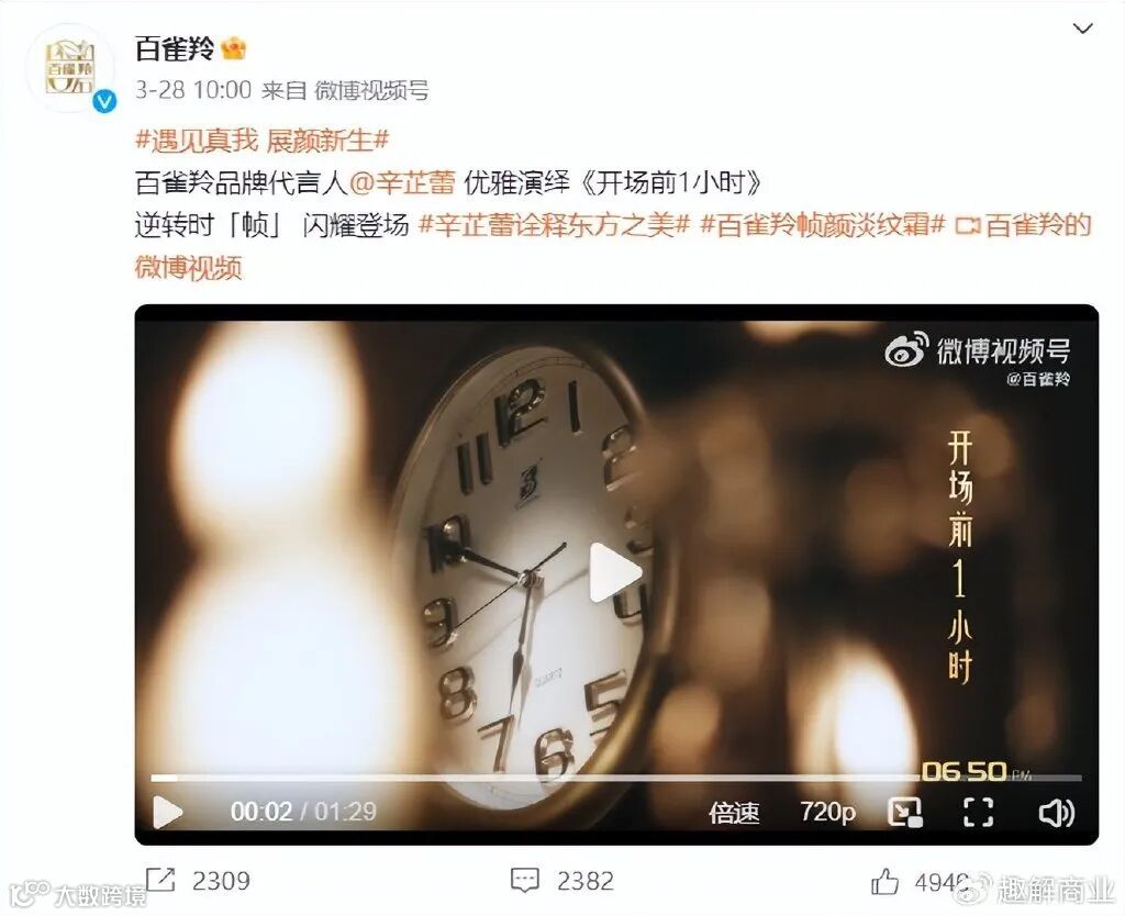 创立近百年,百雀羚能在如今日新月异的美妆市场保持较高的知名度,营销手段是重要原因之一。首先是寻求国民度较高的明星代言。2010年,歌手兼演员莫文蔚代言了草本护肤系列;2020年,新生代偶像王一博成为了百雀羚的代言人;今年,百雀羚牵手《繁花》的李李——辛芷蕾,发布了全新TVC广告片《开场前1小时》,获得了很多人的赞誉。
