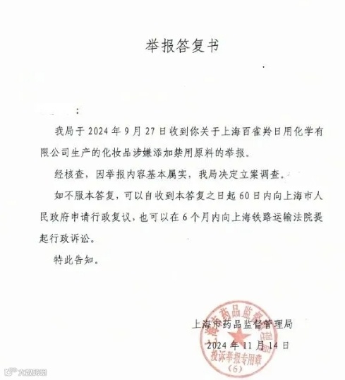 我局于2024年9月27日收到你关于上海百雀羚日用化学有限公司生产的化妆品涉嫌添加禁用原料的举报。