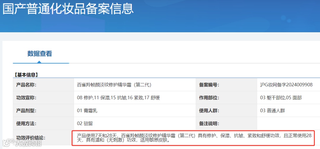 对此,《中国消费者报》记者在国家药品监督管理局官网国产普通化妆品备案信息中查询,该产品备案名称为“百雀羚帧颜淡纹修护精华霜(第二代)”,在功效评价结论一栏显示,“产品使用7天和28天,百雀羚帧颜淡纹修护精华霜(第二代)具有修护、保湿、抗皱、紧致和舒缓功效,且正常使用28天,具有温和(无刺激)功效,适用敏感皮肤”。并没有店铺所宣称的“1小时极速淡纹37%”。
