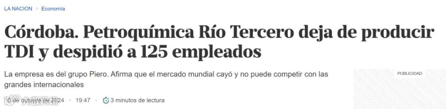 10月10日,阿根廷Petroquímica Río Tercero公司决定于10月14日起停止其位于科尔多瓦的甲苯二异氰酸酯 (TDI) 工厂,并表示将解雇125名员工。