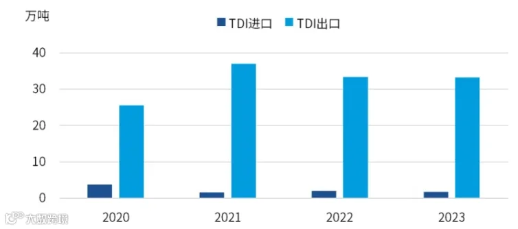 亚洲是全球TDI出口的最主要区域,其中我国贸易量占比达83%,2023年,我国TDI出口达33.3万吨,同比小幅下降0.5%。