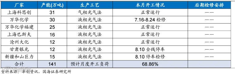 其中,甘肃银光TDI装置已结束单线运行状态,逐步恢复双线运行;韩国韩华3条TDI生产线将于10月15全部停车至月底;上海科思创TDI装置11月装置例行一周停车检修;美国一套装置10月份已经停车进入年度大检。