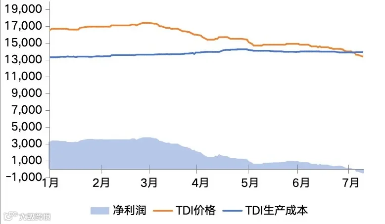 就拿今年1月以来的情况看,在原料成本居高不下、TDI价格快速下跌,再加上需求低迷,3月份以来TDI行业平均净利润大幅下跌。据估算,7月份TDI净利润跌至-500/元左右,多数TDI生产企业净利润已经开始亏损。