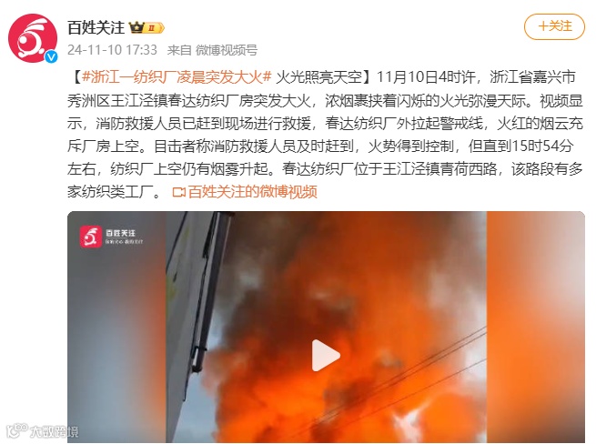 2024年11月10日,秀洲区王江泾镇人民政府发布公告,通报了春达纺织有限公司的火情,公告内容如下: