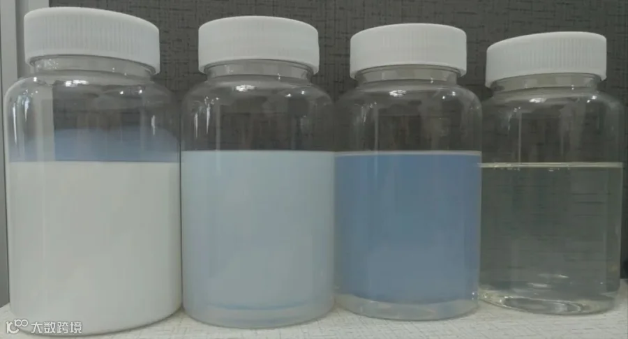 乳液按分散液滴粒径的大小,可分为巨乳液(1~100μm)、乳液(50~500nm)、微乳液(10~100nm)。根据粒径大小,乳液颜色为,乳白色,泛蓝乳白色,泛蓝透明,无色透明。
