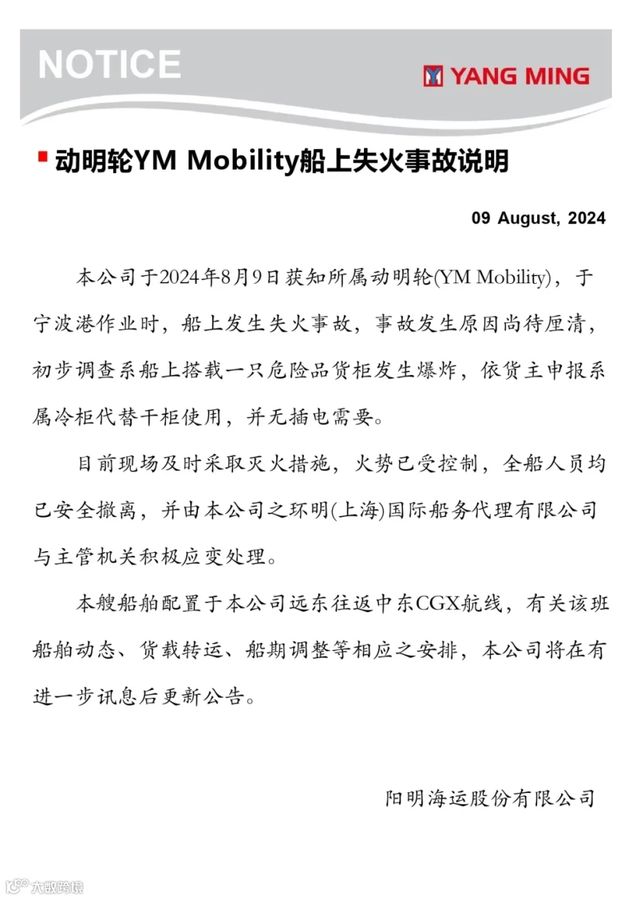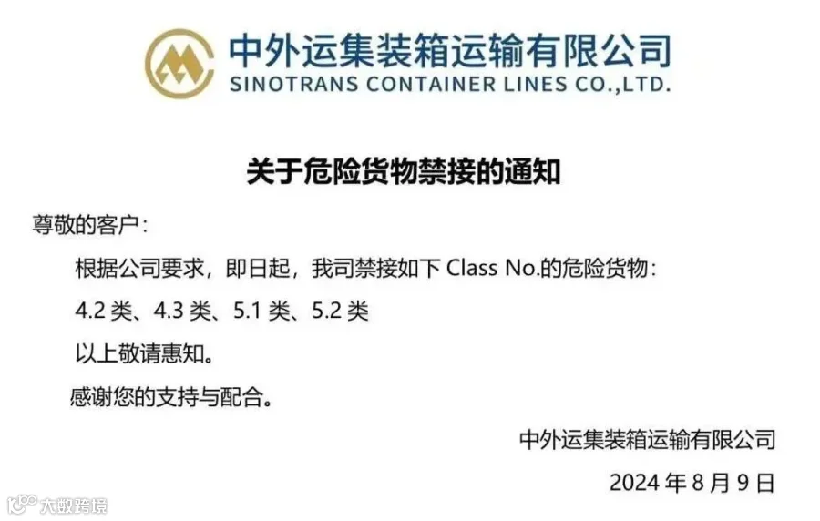 中外运集运发布《关于危险货物禁接的通知》