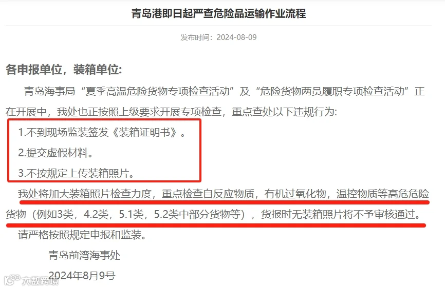 青岛海事局开展“夏季高温危险货物专项检查”及“危险货物两员履职检查”,重点查处不到场监装签发证明、提交虚假材料、不传装箱照片等违规行为,尤其对高危货物特别是对于自反应物质、有机过氧化物温控物质等高危危险货物(如3类、4.2类、5.1类、5.2类中的部分货物)重点检查并加强装箱照片审核,无照片不予通过。请严格按规定申报和监装。