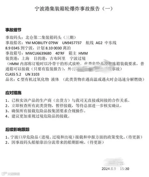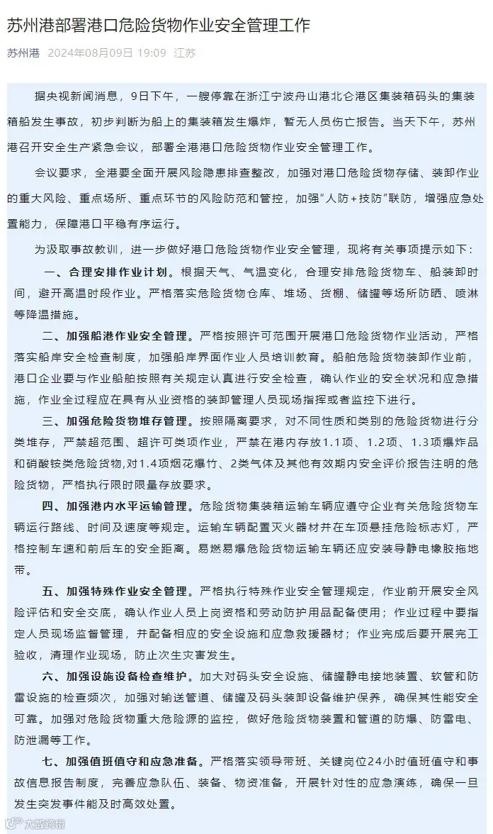 苏州港在宁波舟山港集装箱船爆炸事故后,紧急部署港口危险货物作业安全管理工作,要求全面排查隐患,加强作业计划、船港界面、货物堆存、水平运输、特殊作业、设施设备维护等方面的安全管理,并强化值班值守和应急准备,以保障港口平稳有序运行。