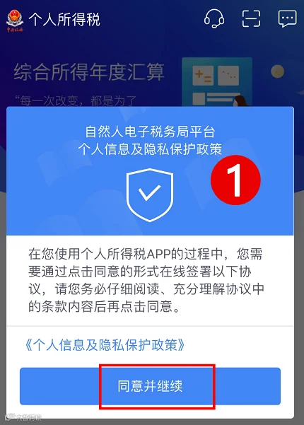 手机下载【个人所得税】APP ,点击【同意并继续】