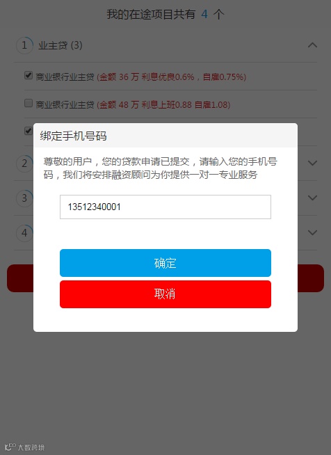 2、客户可以点击产品前的小方框进行选择,然后点击“申请贷款”按键,弹出联系方式对话框,输入联系电话,点击“确认”