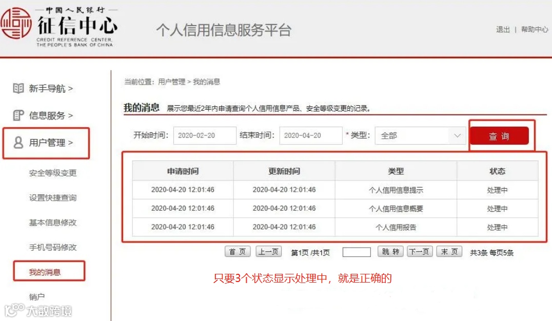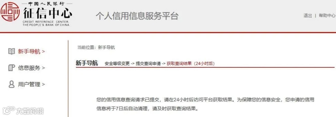 在以上申请提交完成后24小时内系统会发送信息给用户,提醒用户查询成功,用户登录系统即可看到自己的信息报告。