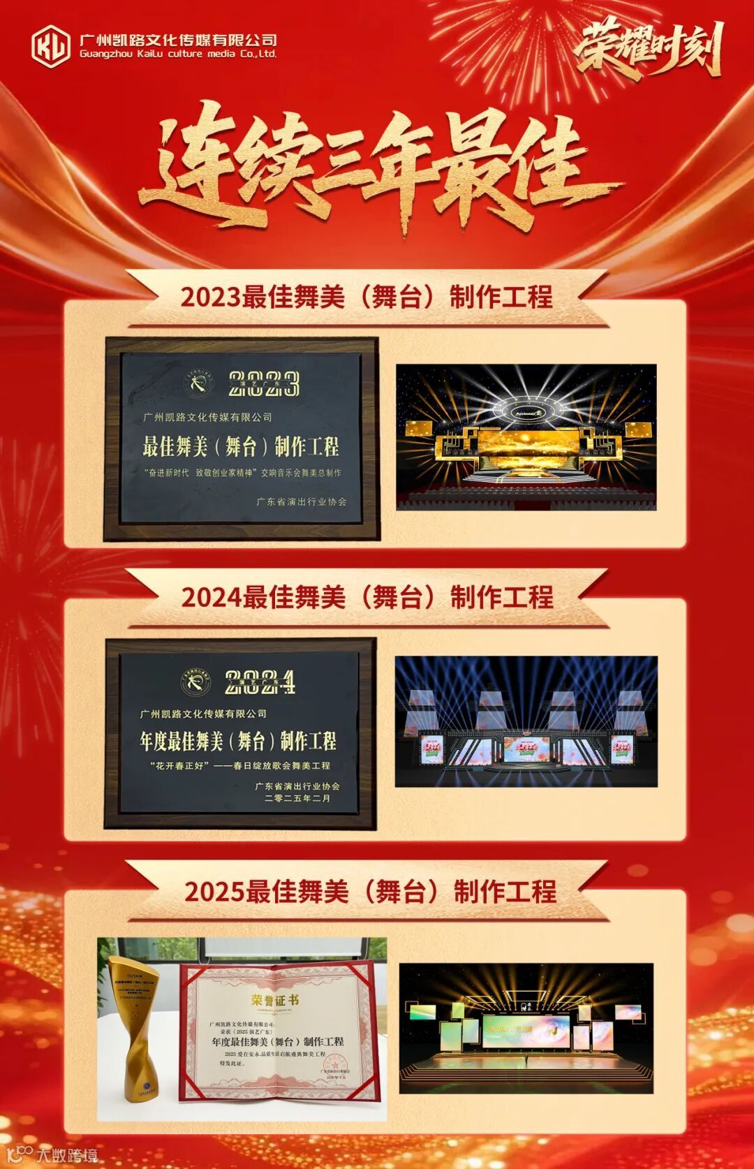 这份三年蝉联的殊荣,是行业对我们艺术追求的高度认可,更是每一位凯路人坚守艺心、精益求精的最好见证。我们始终坚信,舞美从不是简单的搭建与装饰,而是有温度、有灵魂的艺术表达,唯有潜心深耕、精益求精,才能让每一个舞台都绽放独特的艺术光芒,这份认可也将成为我们继续前行的力量。