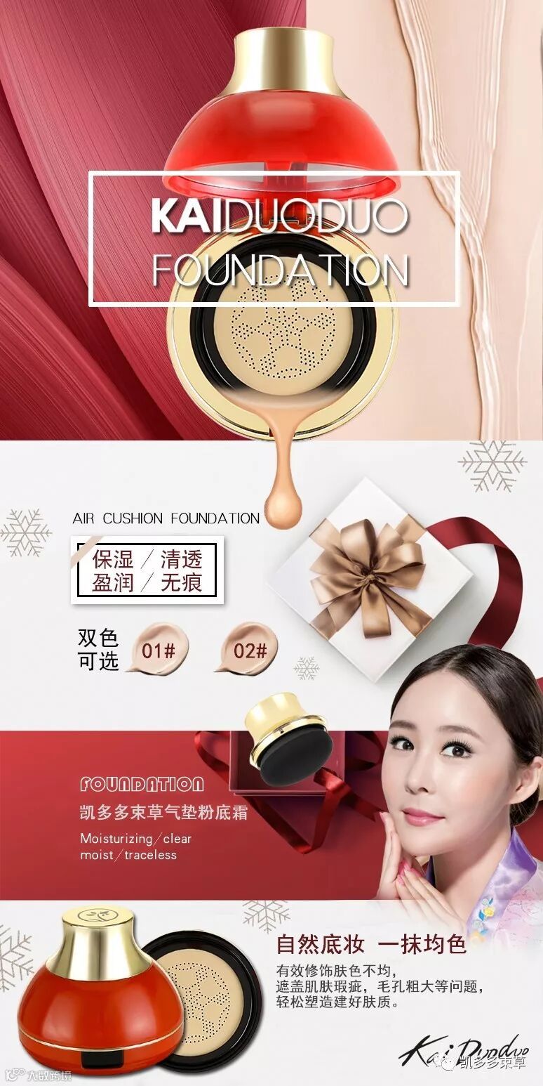 导读:凯多多束草气垫粉底霜提靓肤色 自然轻透,轻若无感,粉质细滑入肤,藏起细纹,隐匿岁月痕迹,呈现健康光泽修护润泽