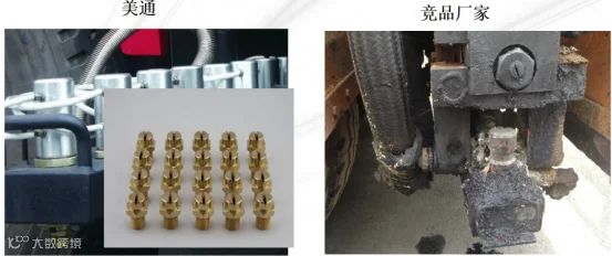 铜喷嘴与喷嘴气缸采用分体式设计,喷嘴气缸独立密封,拆除喷嘴后,喷洒杆不会渗漏沥青;便于更换喷嘴,疏通清理。
