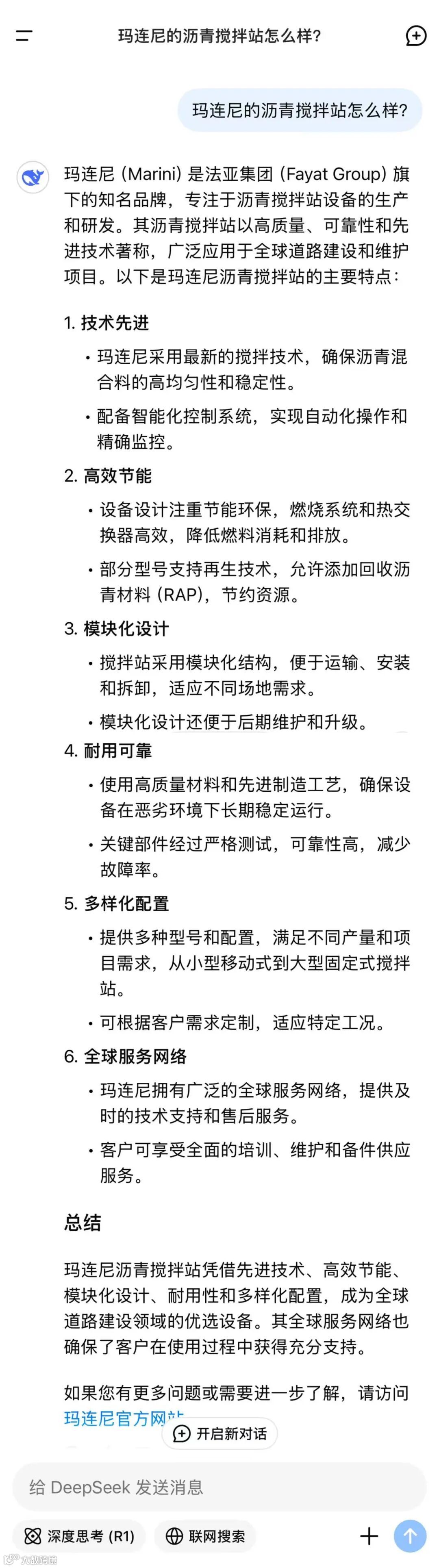 在提问“2025年选择购买玛连尼FRT360沥青搅拌设备,能不能获得良好的经济效益”这个问题时,小编特地选择DeepSeek深度思考模式,让AI更好的展示回答的逻辑,以方便每位客户客观的参考。