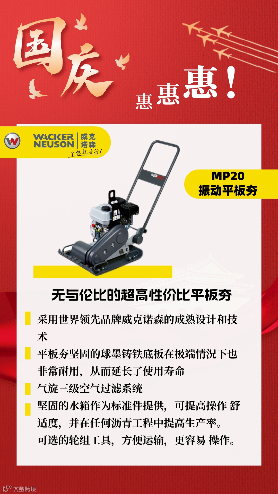 广东远沃建设有限公司为热烈庆祝中华人民共和国成立75周年,广州远沃特别推出国庆尊享优惠。即日起,购买威克诺森MP20平板夯,立享国庆专属折扣,限量特惠,机会难得,先到先得!