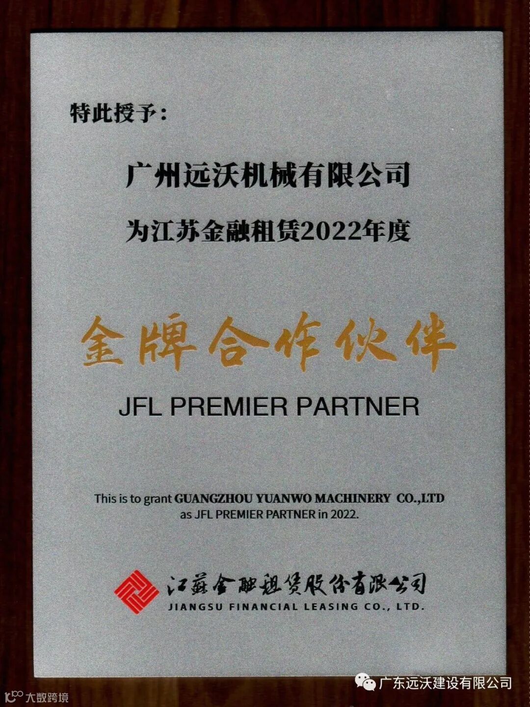 4月21日上午,广州远沃机械有限公司(以下简称“广州远沃”)为江苏金融租赁股份有限公司(以下简称“江苏金租”)2022年度金牌合作伙伴。金牌合作伙伴是江苏金租对于具有诚信经营的合作伙伴的认可,它代表广州远沃在江苏金租的诚实守信,遵守信用评级中处于最高级别。