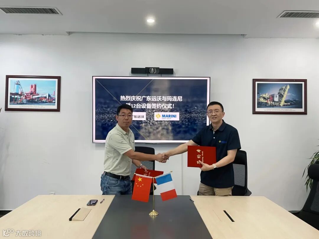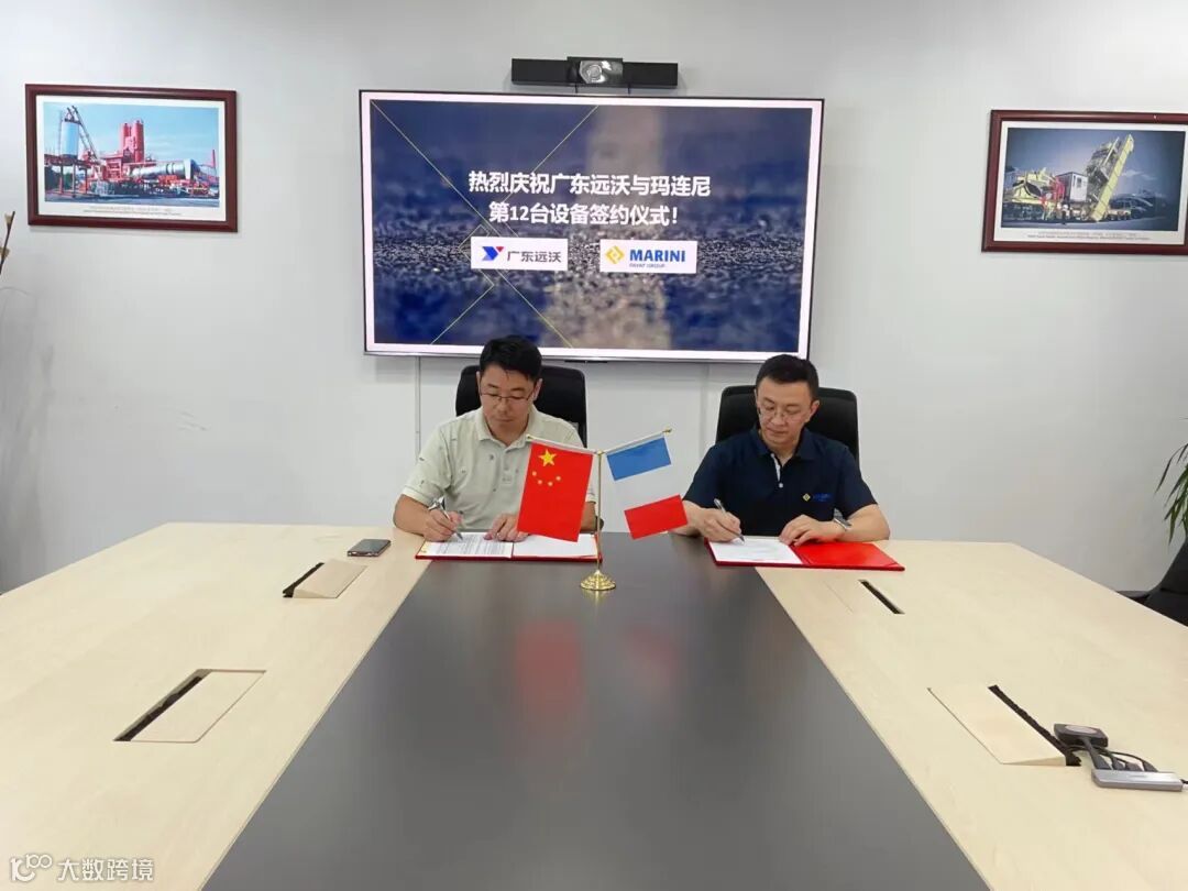 广东远沃建设有限公司总经理刘刚先生与玛连尼(中国)总经理马铁锋先生签订第12台沥青搅拌站销售协议