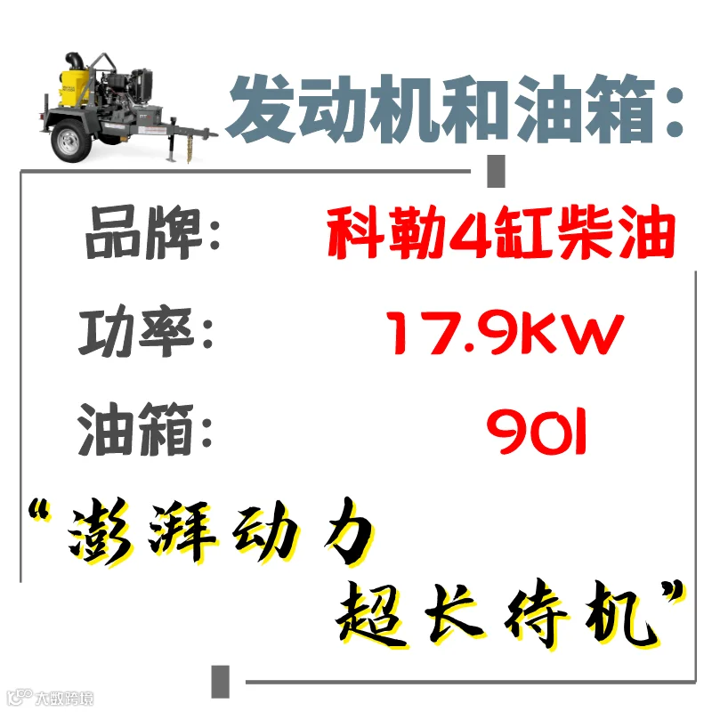 再来看看PT6水泵的其他配置吧。采用科勒水冷4缸柴油发动机,功率高达17.9KW,匹配90升大油箱,可实现长时间运作不停机。