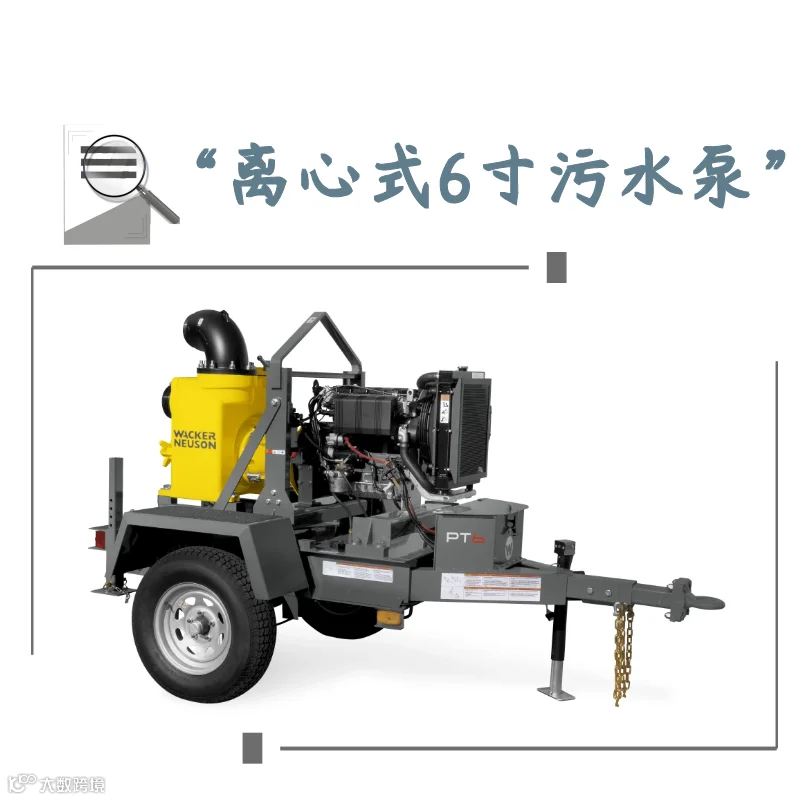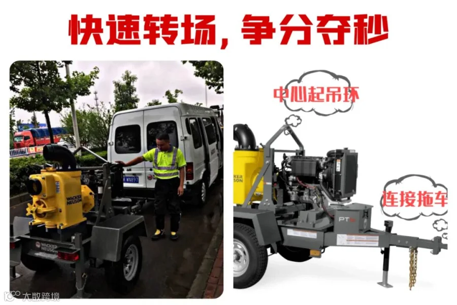 PT6水泵顶部有设计起吊扶手,整个车身拖车设计,仅需1个小挂钩就能快速挂上小货车抵达目的地啦!