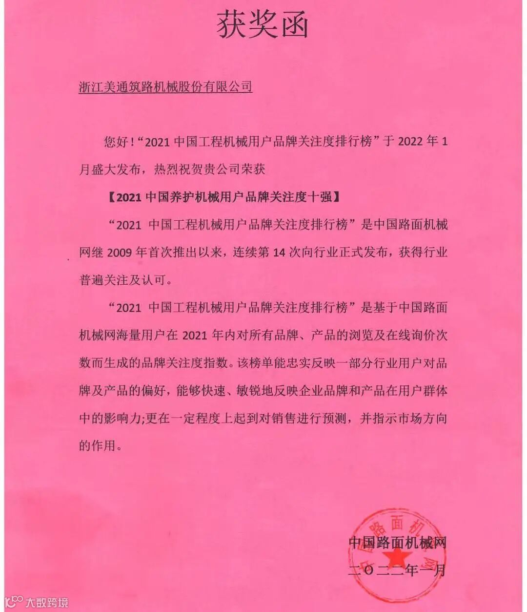 2022年1月浙江美通筑路机械股份有限公司荣获【2021中国养护机械用户品牌关注度十强】荣誉称号。“2021中国工程机械用户品牌关注度排行榜”活动由中国路面机械网主办,该媒体是目前国内路面机械行业最有影响力的网络媒体之一,在业界享有很高的信誉,得到行业的普遍关注和认可。