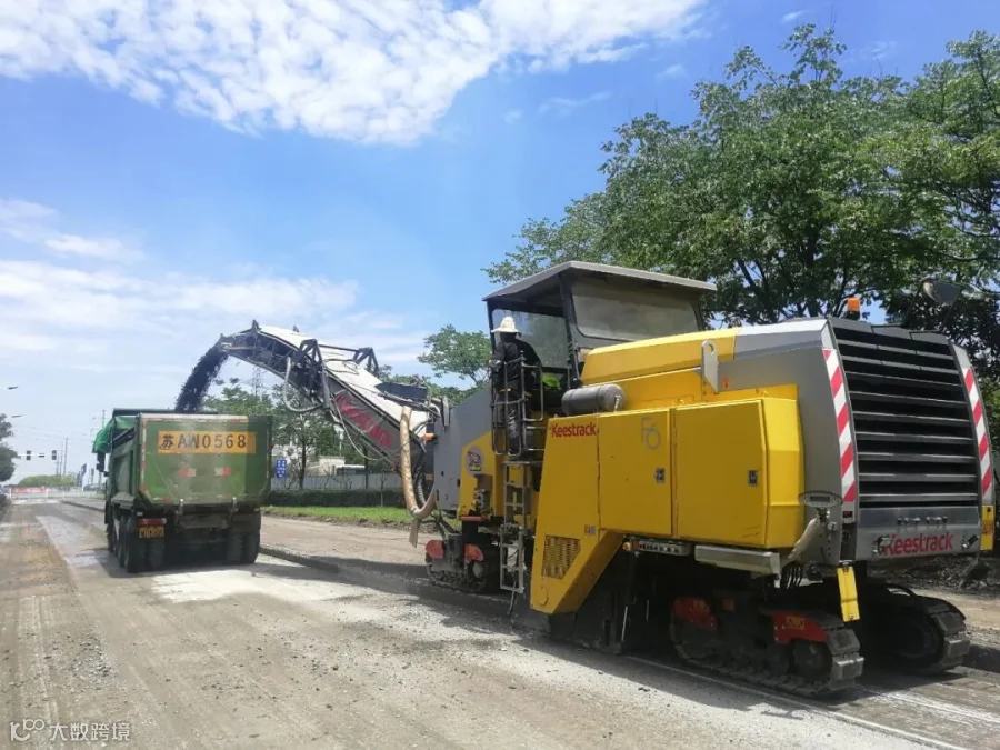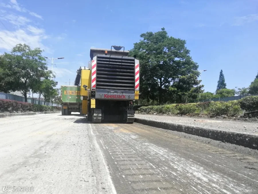 根据施工方要求,此次机动车道铣刨约13,000m²,铣刨厚度为60cm,需要凯斯特F6铣刨机分三层铣刨,沥青层10cm,水泥稳定碎石基层分两层各铣刨25cm。