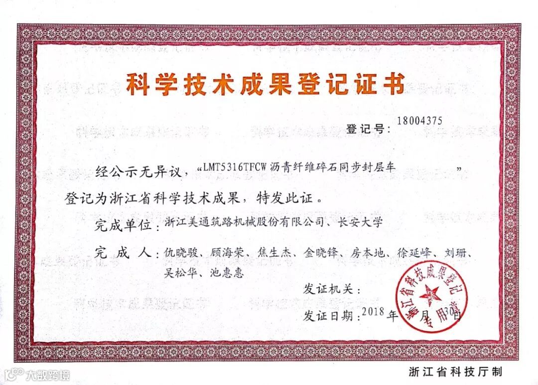 同年三月,由中国工程机械工业协会组织的“LMT5316TFCW沥青纤维碎石同步封层车”专家鉴定会在浙江美通筑路机械股份有限公司召开,本次鉴定会由中国工程机械工业协会荣誉会长韩学松亲自组织,太原科技大学教授、博士生导师徐格宁(主任),同济大学教授、博士生导师王安麟(副主任),天津工程机械研究院有限公司教授级高级工程师尚海波等行业内十余名知名专家参加。