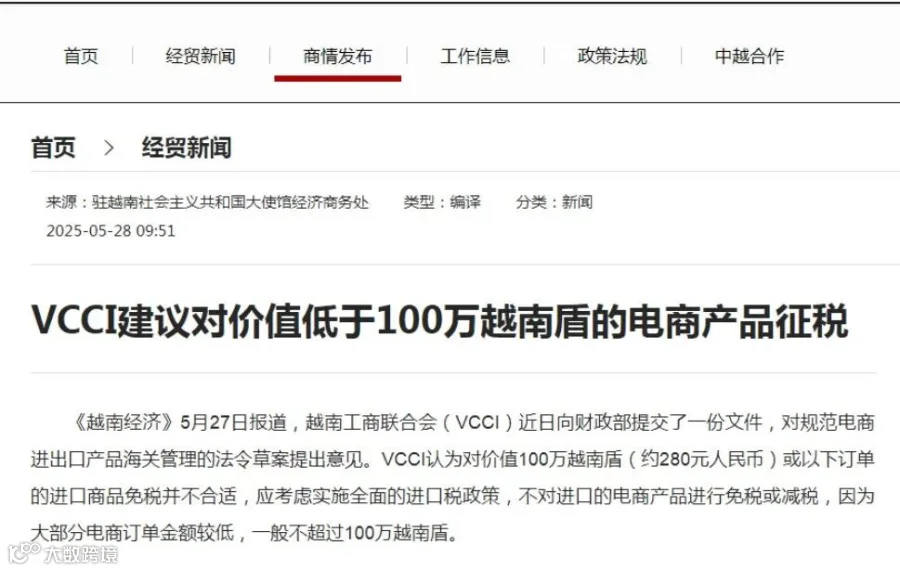 VCCI认为对价值100万越南盾(约280元人民币)或以下订单的进口商品免税并不合适,应考虑实施全面的进口税政策,不对进口的电商产品进行免税或减税,因为大部分电商订单金额较低,一般不超过100万越南盾。